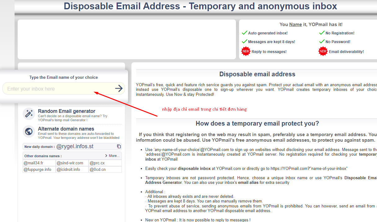 Bước 4: Truy cập Web yopmail.com và nhập địa chỉ email dùng để lấy mã trong phần chi tiết đơn hàng